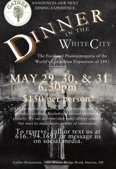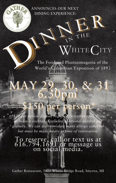 Our Dining Experiences are the most unique dinners you will find in West Michigan. And that's not an exaggeration. Prepare yourself for a journey into storytelling and haute cuisine. This time, we travel to 1893, Chicago where millions are flocking to see the White City and the wonders of the world. Along the way, we journey through the Midway Plaisance, where Buffalo Bill Cody wows you with his cowboy antics, among the many other scintillating stopovers. This three-hour dinner features a curated wine selection, 14-17 small plates, and a culinary experience you'll be telling your friends about for years.